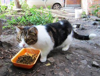 Фенотипичная британка или шотландка живет на улице и ищет себе хозяев, стерелизована ест сушку.