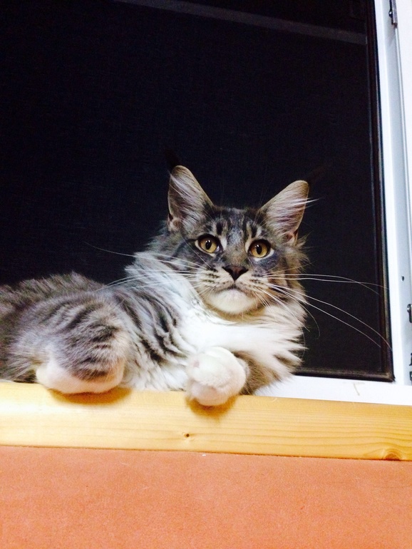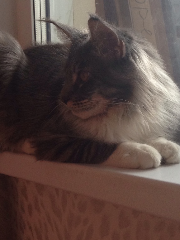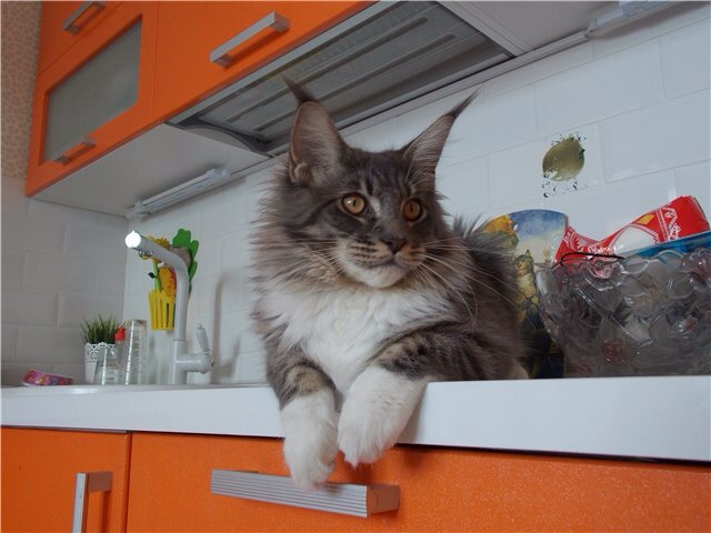 Он очень спокойный, абсолютно не агрессивный. Постоянно рядом, как собака. Даже, пардон, в туалете))) В то же время на руках сидит только у меня. От мужа и дочки убегает. Играет со всеми и во всё ))) В пол года весил ровно 5 кг. Слонопотамчик)))