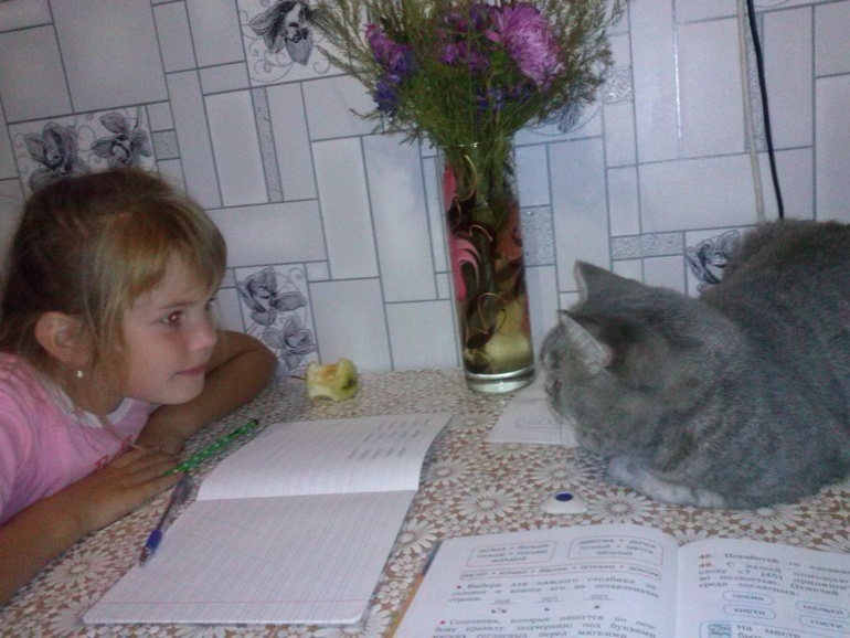Красавец! Наша тоже любит помогать с уроками, только видит что сел за стол с учебниками, бежит и так же ложится.