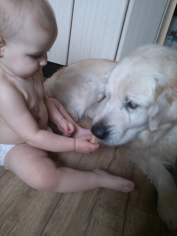 Любашка еще не поняла, но пес ее уже по- полной использует. Он же все время посется на кухне, а тут такая удача!!!!