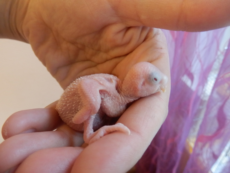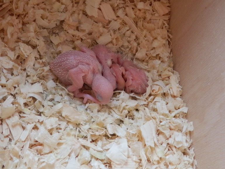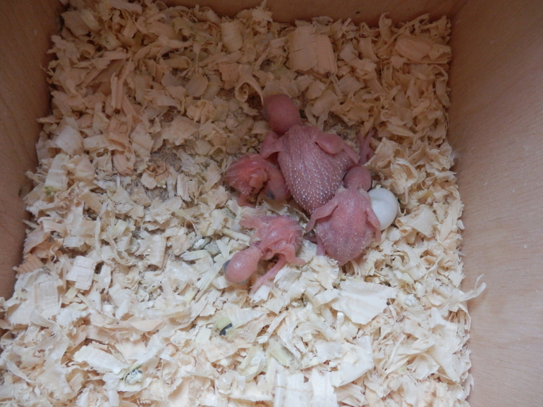 Всего у них 4 птенчика, старшему неделя, он начал открывать глаза, и каково же было удивление - он ( она) - альбино или лютино ( с красными глазами)!