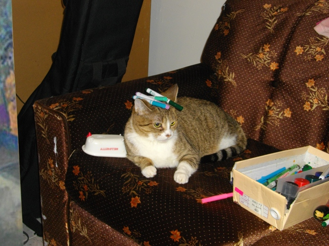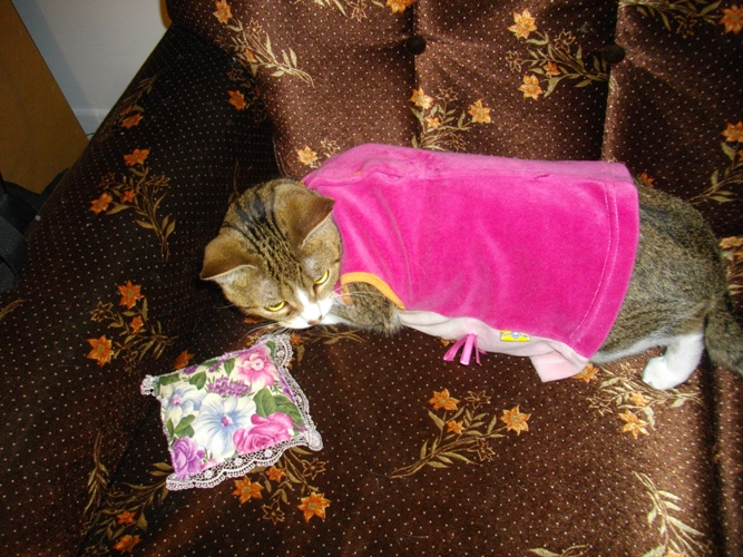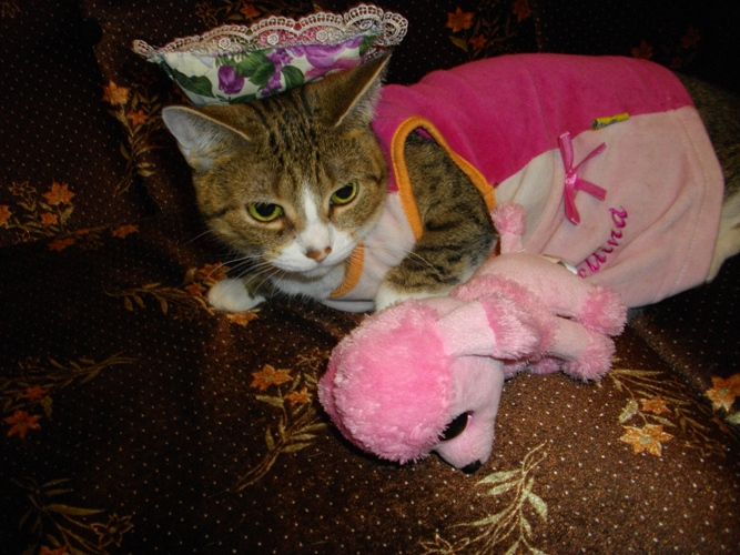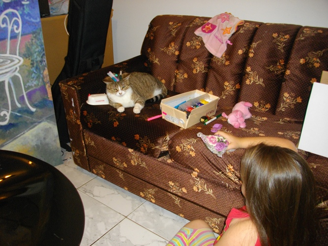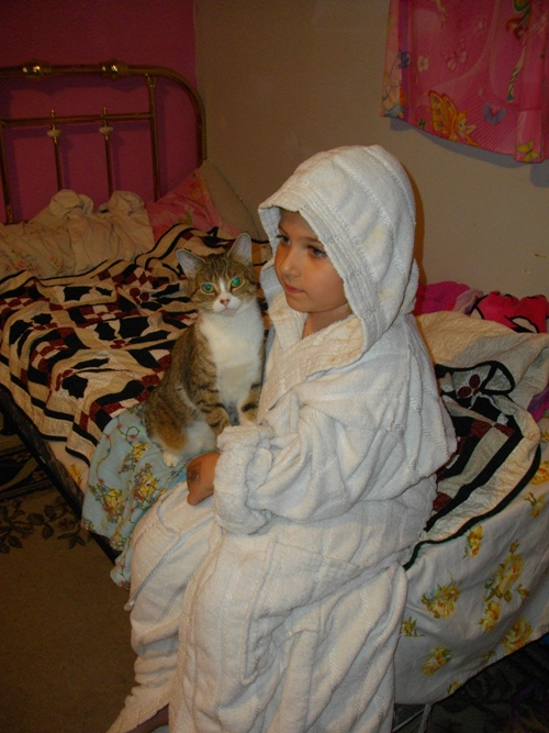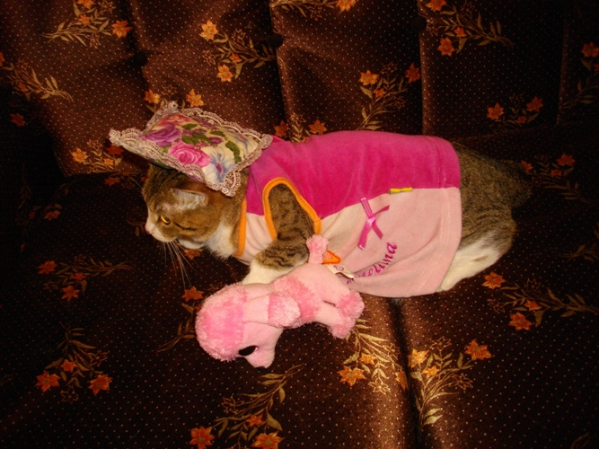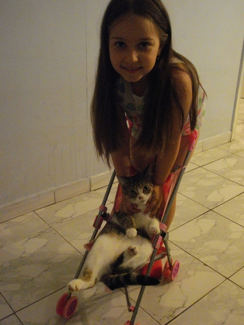 И не отходит от нее ни на шаг! Она в душ - он за ней, она играет - он к ней, и все терпит - и как она его слушает, играет в доктора, и как она ему фломастеры на голову складывает (кот САМ приходит играть, она его не тащит насильно!), и как она его в коляску укладывает, играет с ним в дочки-матери, и даже как она его переодевает в платьишки)))