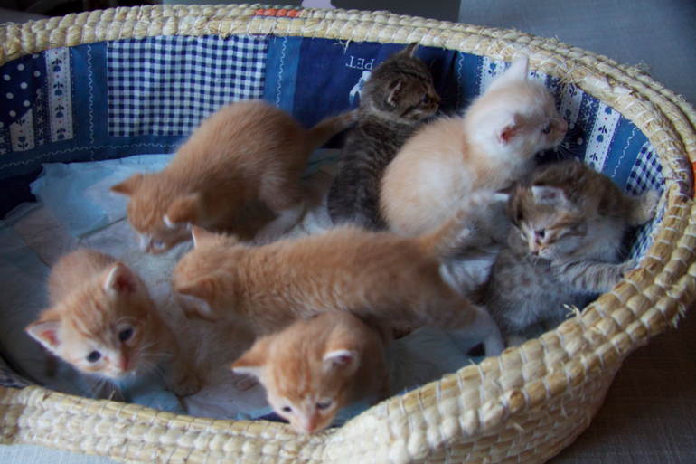 Так вот, почти полтора месяца назад отвезли нашу девочку на стерилизацию, ветеринар сказал что она беременная, есть вариант почистить ее от котят, или стерилизовать после родов. Кстати врач сказал, что скорее всего их будет две три штуки))) Их родилось 7!!!!! сейчас им уже месяц. Потихоньку раздаю, завтра троих забирают. Они чудесные. А дети мои начинают хныкать, привыкли к ним)