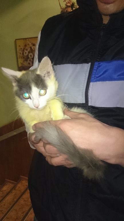 Сделали подстилку, покормили, людей не боится, бодрый, руку подставляешь, трется, мурчит. Ощущение, что кто-то над ним поиздевался....котенок желтый!!! Но не желтушный, т.к. морда белая, но и не йод. Глазки, носик чистые, ушки черные, но не думаю, что клещ, скорее отит, т.к. на улице все-таки холодно.