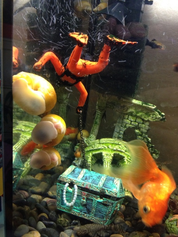 ) жили 2 золотые рыбки и телескоп , периодически всякая мелочь и сомики. но к нам пришли именно с тремя рыбками, телескоп умер через пару месяцев, подселили еще два маленьких сомика-прилипал . и вот сегодня привезла мне подружка еще рыбок и улиток(я даже не представляла что такие (огромные) бывают для аквариумов ))) и в детский садик, тк поздно вернулись охранник не открыл сад и на ночь всех рыбок запустили в мой .