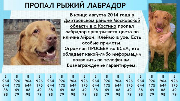 волонтеры щербинского приюта недавно нашли сбитого машиной лабра, вроде рыжего.контакты вроде вот эти:8-916-356-21-00 – Галина (с 17-00 до 23-00),8-916-566-47-42 – Лариса,8-905-789-71-46 – Альбинаточнее по кнтактам буду знать чуть позже. - это он на клавсе, звонили?http://www.claws.ru/cgi-bin/base.pl?base=0&id=22190