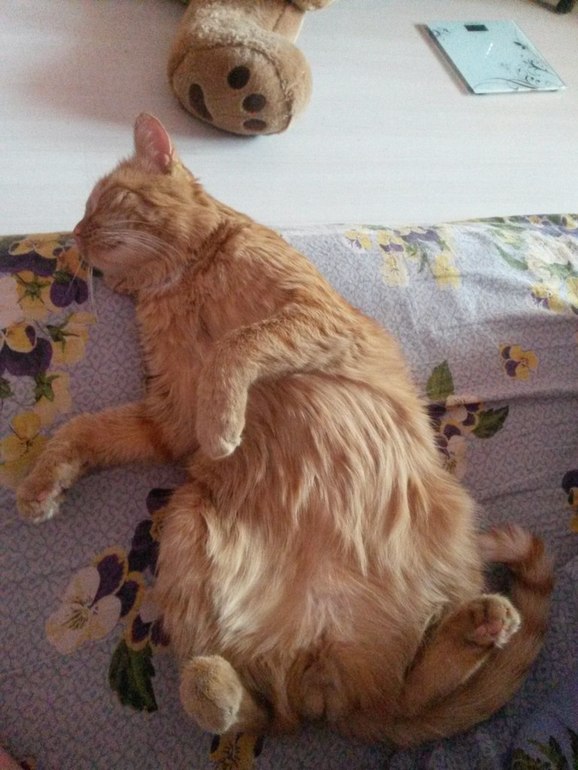У нас два, так старший равнодушен к человеческой пище, только понюхать может и брезгливо морщится. А мелкий любит стащить кусочек колбасы (только колбасы), но он ее не ест, а охотится на этот кусок.Рыжик ваш — прелесть!