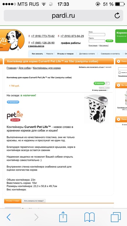 Пользуюсь контейнером на 20 кг, очень довольна. Ничего не сохнет, запаха нет за счет герметичной закупорки. Но в продаже таких не видела, достался нам по спец. акции от Роял Канин.