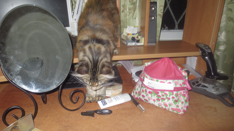утром ходила за мной, когда я на работу собиралась, пока я красилась - изучала косметику и кисточки мои.