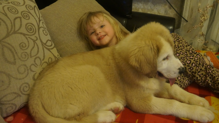 Девочки! всем большое спасибо,что не прошли мимо. Простите,что не ответила каждой)))) Отвечаю всем сразу. Собаку купили,рады до безумия все,даже самая маленькая))) Пока она в доме с нами,на лето в вальер пойдет.(кошек заигрывает))) вот наша Ляля)) На фото ей 3,5 мес.
