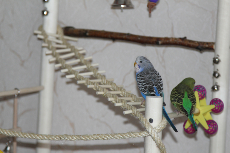 В общем птички мои довольны, особо нравится лестница и вертушка справа на жерди))) Большую площадку на самом верху пока побаиваются, но правда Петрушка уже пыталася приземлиться на нее.