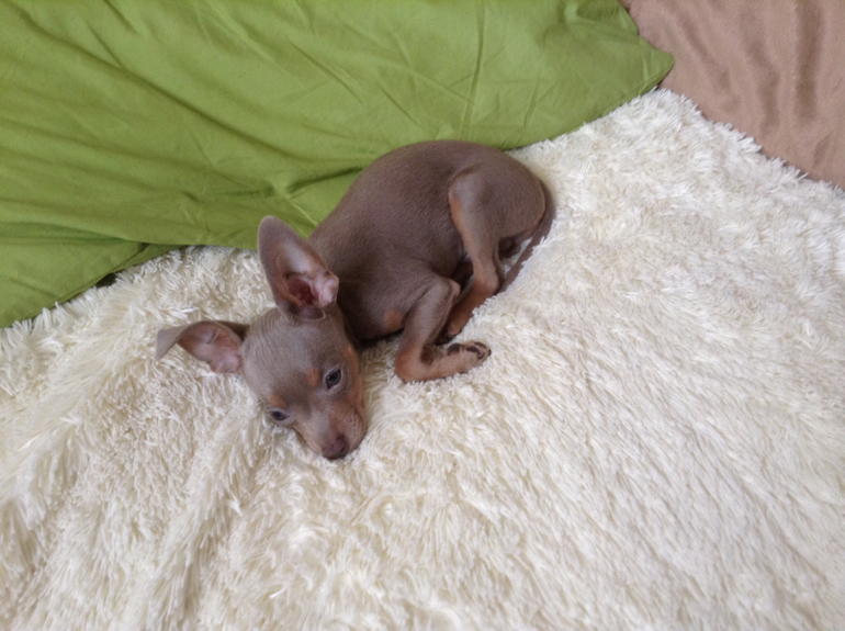 Два дня уже пускаем на кровать с нами поваляться) но ночью спим в домике.