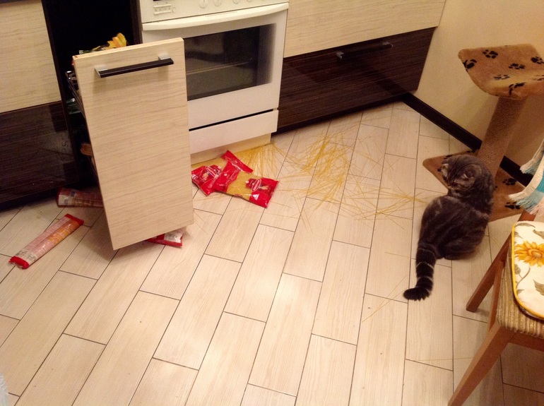 Наши пёсы привязаны. Так что мало куда дотянутся могут (тьфу-тьфу-тьфу).Но вот Лара, пока сидела на поводке, периодически его разгрызала и вольготно весь день хулиганила в квартире в наше отсутствие. Все кошачьи миски погрызла, скотина! В результате муж любимый разозлился и купил ей цепь. Сидит теперь на цепи и цепью брякает. А наш кот Соловушка научился шкаф под окном на кухне открывать. Пришлось оттуда всё опасное и вкусное убрать. Но он всё равно каждый день его открывает и они всей компанией там лазают между пустых банок.