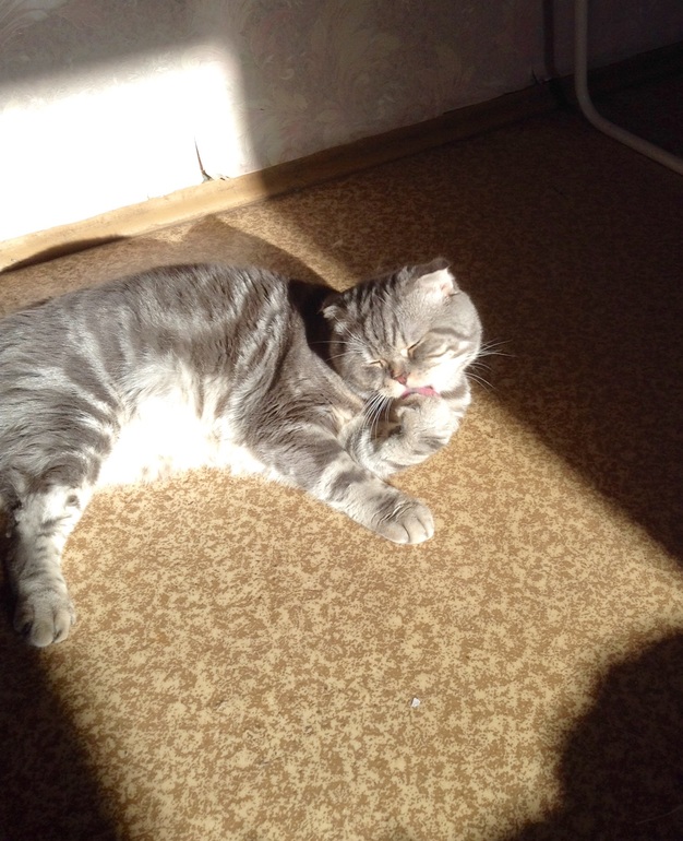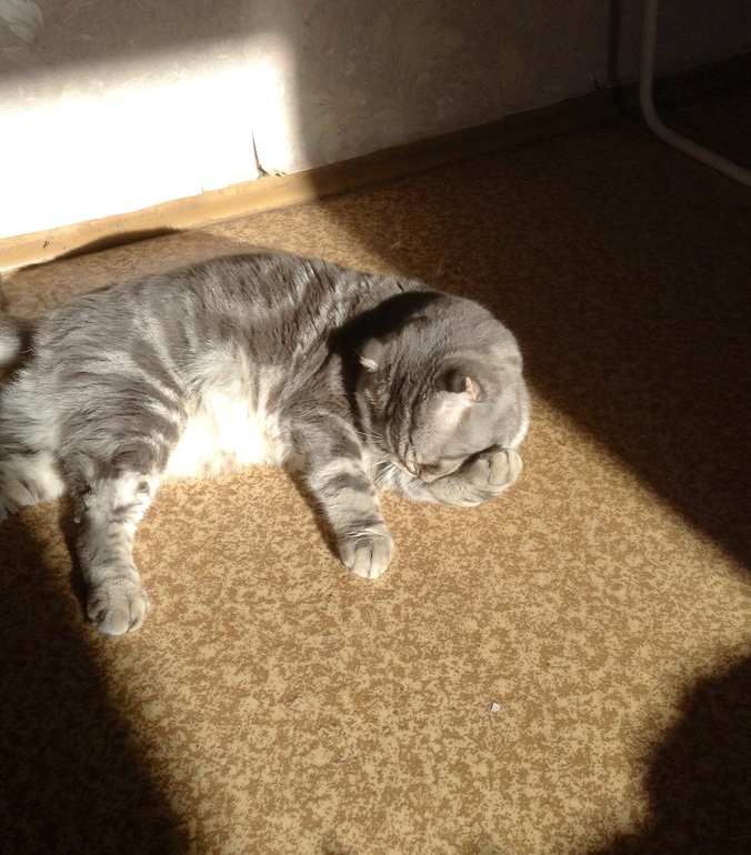 знаешь, я раньше не наблюдала за ним любовь к солнцу... он же оч меховой, жарко ведь... Больше на балконе тусуется)а тут залег