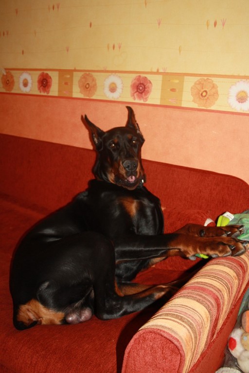 Представляю!!! Наша тойка тоже любит на коленках сидеть и обниматься))) Но где той-терьер, и где доберман....))))