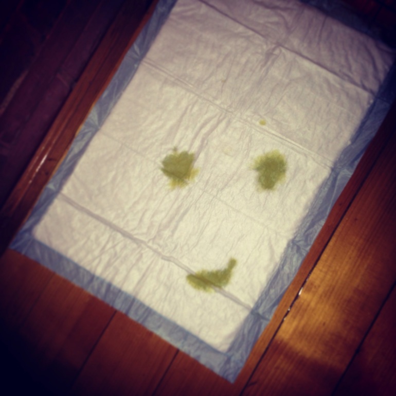 Дома мы ходим на пеленку, которая лежит в собачьем плоском лотке , а это на даче смайлики делаем)))