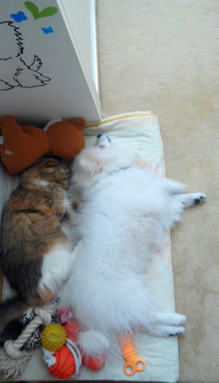 А вот так мои спали, собакин считал кота своим щенком, и защищал и вылизывал. хотя оба мальчики