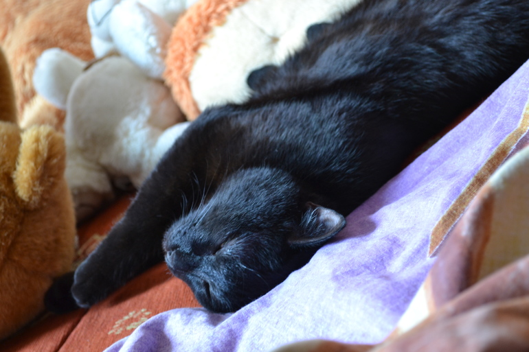 Характер у нашего Михаила ну очень темпераментный, вредный, не любитель ласк! В редких случаях он подойдет сам по ластится, или запрыгнет на руки чтобы его погладили. Я уж не говорю о том, что мы практически не слышим как он мурлычет, зато ежедневно наблюдаем и слушаем его храп когда спит... Кстати спит в различных позах, кроме нормальной "кошачьей" позы! Обычно разваливается на пол кровати, дивана, подушки, и не важно где, главное как! Так что порой, перед тем как ложится приходится аккуратненько лечь там, где осталось свободное место, чтобы не разбудить "царевича"! Обожает спать в ногах, там ведь тепло, и опять таки не в обычной позе "комочка", а нормально так развалится! Что самому не повернутся ни как!