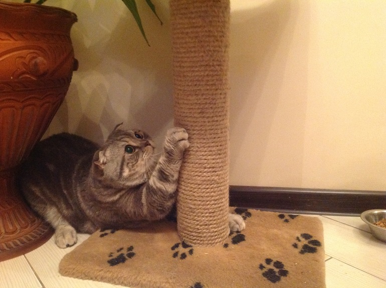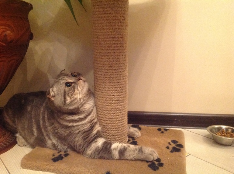 милаха) у нас похожая когтедерка , повыше немного (муж сделал сам) стоит на балконе, наш красавчик там за птичками наблюдает.