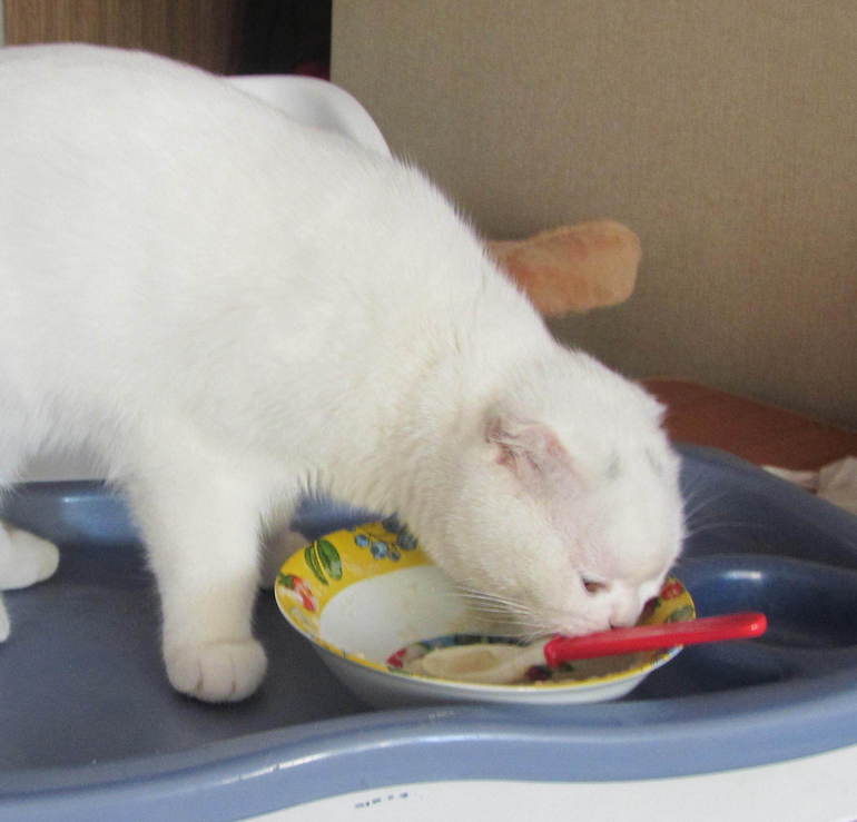 Кошки. Болезни, прививки, советы по уходуНемного нашей истории. У нас белая вислоухая шотландочка очаровашка Нора. Возраст 5,5 мес. Умничка девочка ласковая и игривая. Кормим её с недавнего времени кормом для котят Про-План.До этого кушала натуралку. Готовила,заморачивалась на всём:телятина проможенная,куриное феле проваренное,каши,молочная детская смесь,творог обезжиреный,желток яичный. Но если честно,проще купить готовый корм,т.к. наша маленькая дочь всё больше и больше требует к себе внимания и на отдельные приготовления кошке времени почти не хватает. Так вот столкнулись теперь с проблемой. Кошка ест корм с удовольствием,не голодная,но...! С ума сходит по блюдам которые я готовлю сейчас для ребёнка. Не даёт спокойно покормить дочь. Ходит вокруг орёт,просит! Запрыгивает на столик когда кормлю дочку и если не получается влезть в тарелку,а я ругаю за это,слизывает каши прямо со щёк ребёнка.Сбросишь её,она 50 раз ещё запрыгнет. Каши покупные Нестле с фруктами молочные и безмолочные (яблоко-груша,яблоко-банан,черника,в общем разные). Дала дочке овсянку и размяла в ней свежий банан и даже это кошку не останавливает.Пока умою после еды дочь,кошка уже вылижет всё что осталось на тарелке!))))