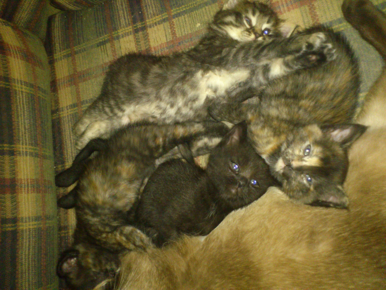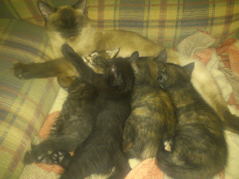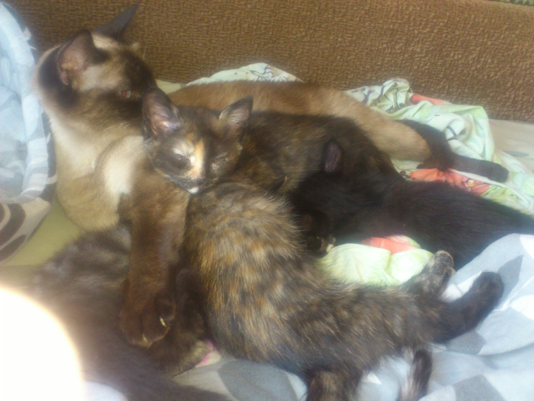 Нашему Феликсу уже 11 лет. Тоже когда-то взяли его месячным котёнком от такой же сиамской мамы и простого папани. И был он многоцветный, как у Вас на фото. Совершенно замечательный кот вырос. Хороших мам-пап Вашим малышам, добрых ручек!)
