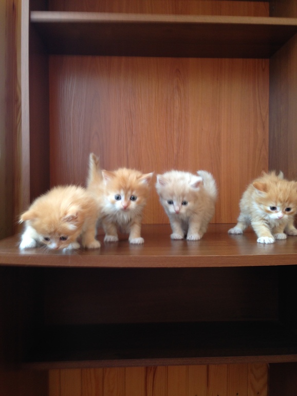 Мама сибирская красная, папа без породы домашний ухоженный рыжий кот.