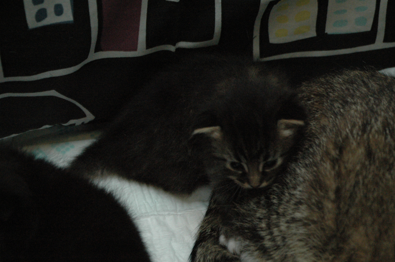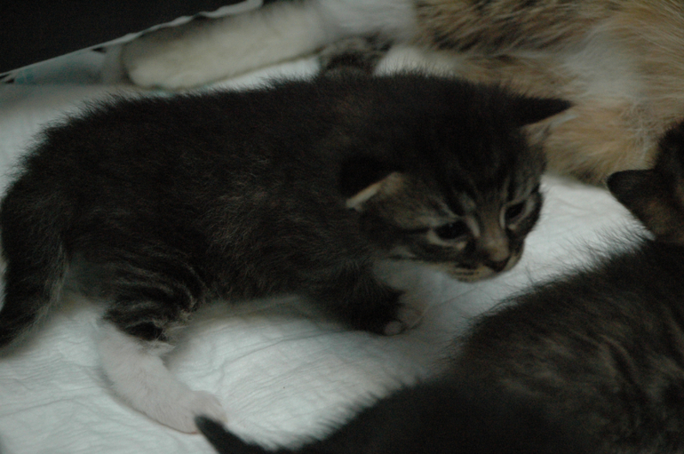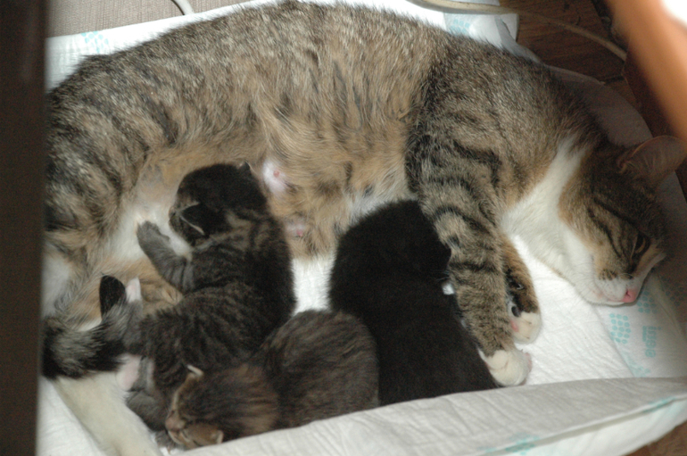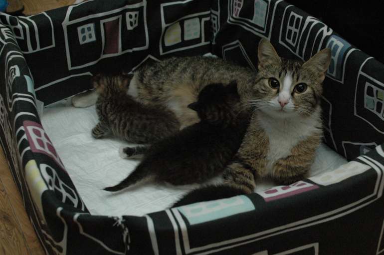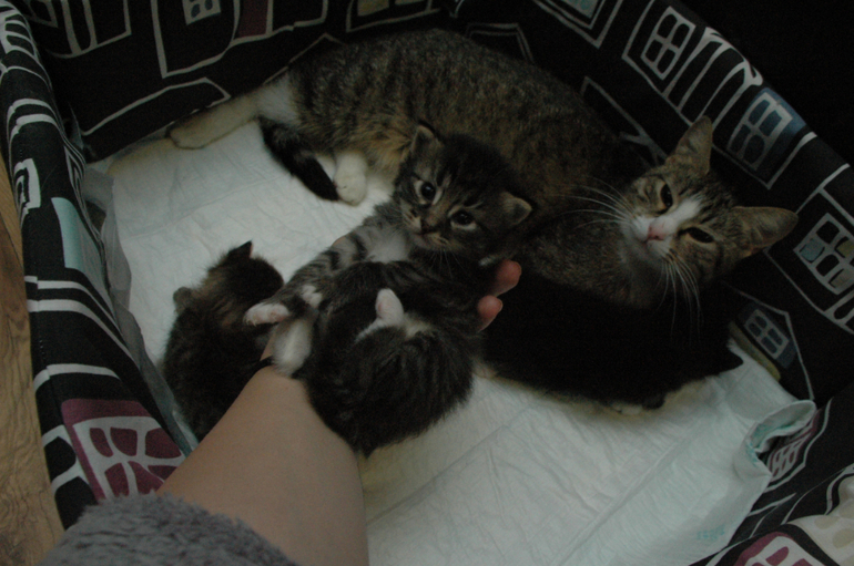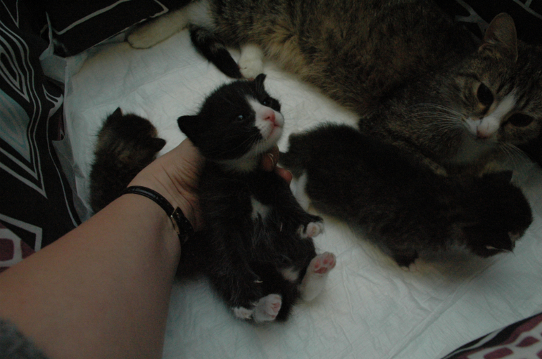 Я почему ее и заметила, котенок первый и на тот момент единственный который родился, орал истошно, от холода. Я, когда его в руки взяла - он был как лед. В общем. В тот раз помыться не удалось. Зато прибавление в семье, +3 котят, один, к сожалению погиб, видимо еще в утробе, наверное, кошку сильно пнули. (