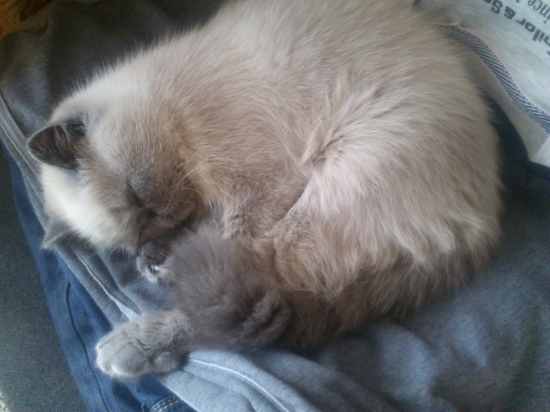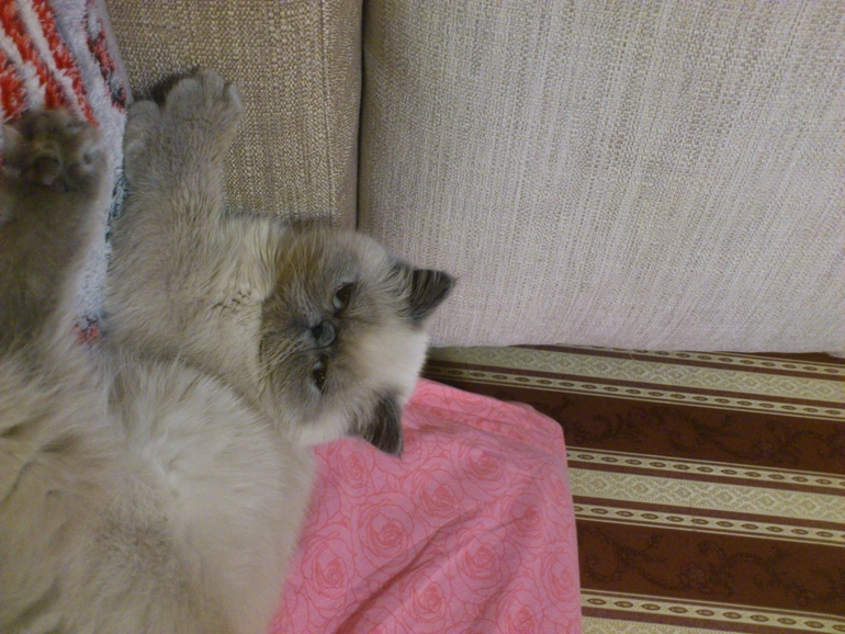 Ликуська, толстая моя стерилизованная британка. Ещё в декабре была 3,5 кг, сейчас уже 5,5 кг. В последнее время шёрстка такая плотная плюшевая стала, что никто не пройдёт мимо, что бы её не потрогать. Ночами вредная до ужаса, у неё мания разбудить меня за ночь раз 50 не меньше. Иногда ночью и получает тапком по толстому заду. Утром, разбудив меня наконец, с чувством выполненного долга, заваливается спать.