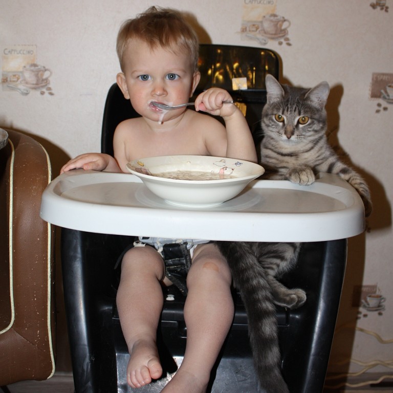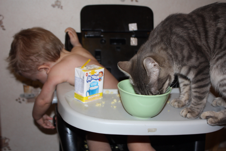 А ребенок, потом с той тарелке кушает? откуда кот поел? интересно просто)