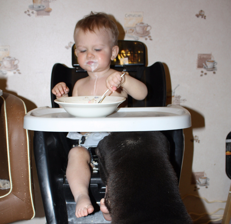 Обычно кот лезет, когда Димка уже поел. А бывает Димка из собачей моски корм таскает