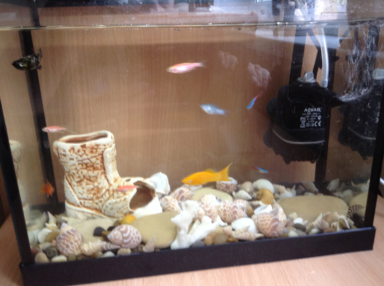Получается три мелких розовых, три неончика, одна черная, одна красная, одна белая, одна оранжевая, одна пятнистая, сомик мелкий полосатый, сом большой пятнистый, две ракушки.Ракушки и камни кипятила. А какая температура должна быть воды? Может градусник купить?Про долив воды поняла.