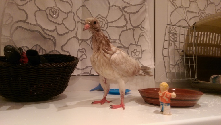 Достала и хожу с ним в руках, что делать, не знаю. Вспомнила про переноску кошачью, постелила бумагу и посадила. Он орет, голодный видимо. Насыпала хлебных крошек)))) Не ест. Вечером ушла на прогулку, пришел муж и накормил его. Оказывается, он вспомнил как птицы кормят птенцов и сложил кулак трубочкой, наложил туда каши жидкой, голубенок наелся и замолчал. Ну и потом дети назвали его Одуванчиком. Жил у нас в переноске, на окне. Кормила утром , вечером муж. Выпускали полетать по комнате, купался в ванне. Он у нас прожил два месяца с лишним. Оперился, на голове стал появляться хохолок.