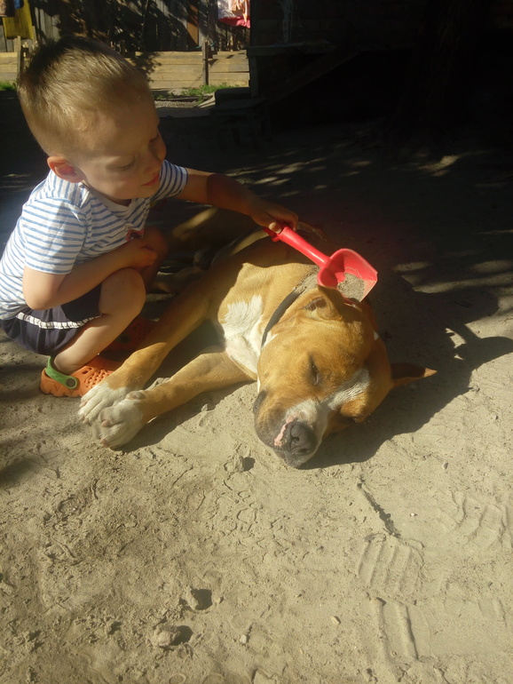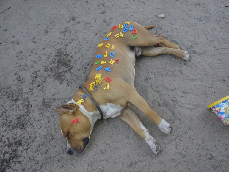 ДД, Вот эти фоты надо вывешивать на сайтах, где пишут, что стаффы — это собаки-убийцы!!! Когда мама или я выходим со своей недостаффихой (ну клюв у нас очень длинный для стаффа), то все мамочки, ну почти все мамочки, начинают истерично орать, чтобы мы убрали "монстра" и "собаку-убийцу, а то она сожрет детишек"!!! Здоровья всей семье, включая чудесного стаффа!!
