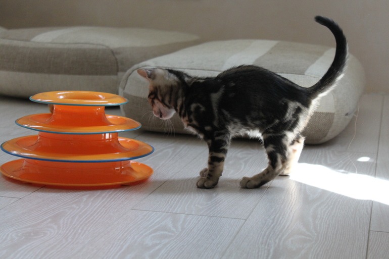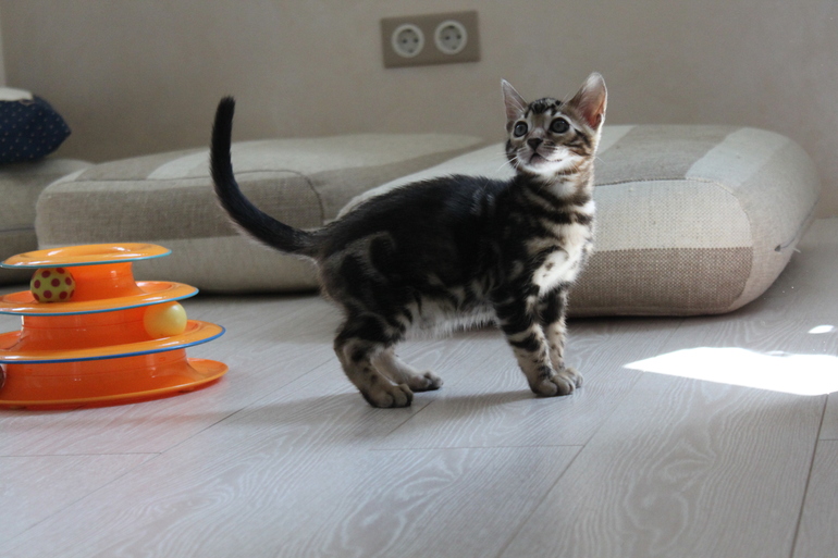 Котята почти весь день гуляют по первому этажу, а на ночь я загоняю их в вольер. Вообще с нашей планировкой очень внимательно нужно следить за малышами, чтоб не забрались на лестницу .