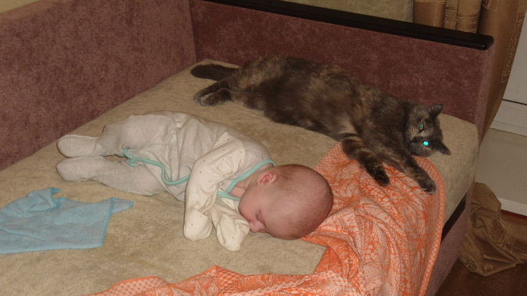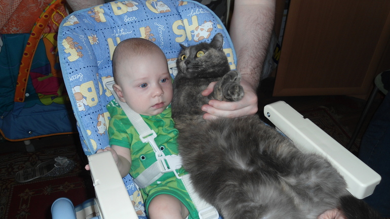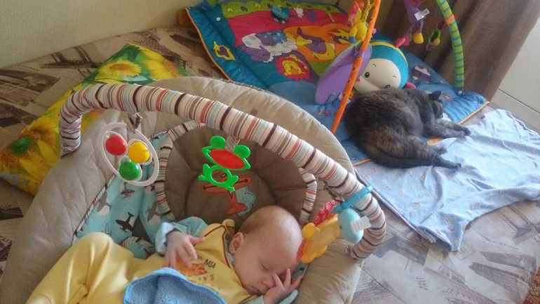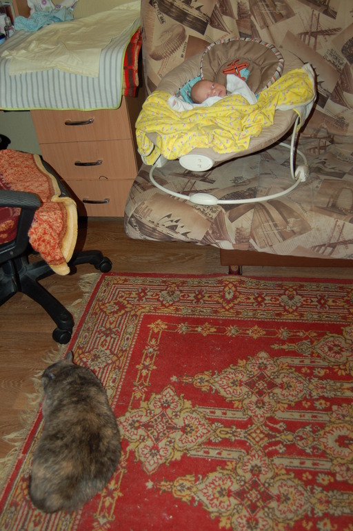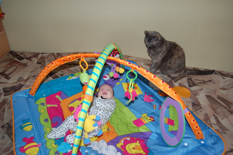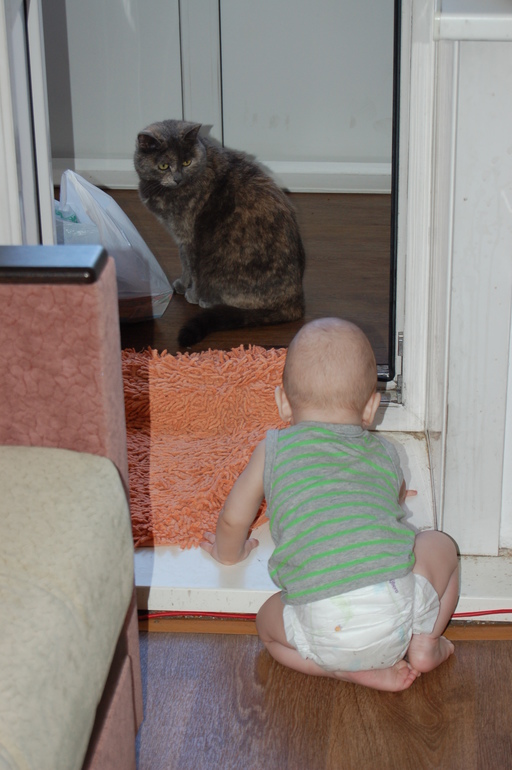 А потом в нашей жизни появился Егор. Сначала он ее даже не замечал, она ходила вокруг, пыталась понюхать, пыталась проникнуть в кроватку и обследовать ее. Потом Егор стал ей улыбаться, а сейчас видит ее и ползет! Пока ей удается убежать. Причем ждет до последнего момента и потом отпрыгивает.