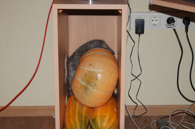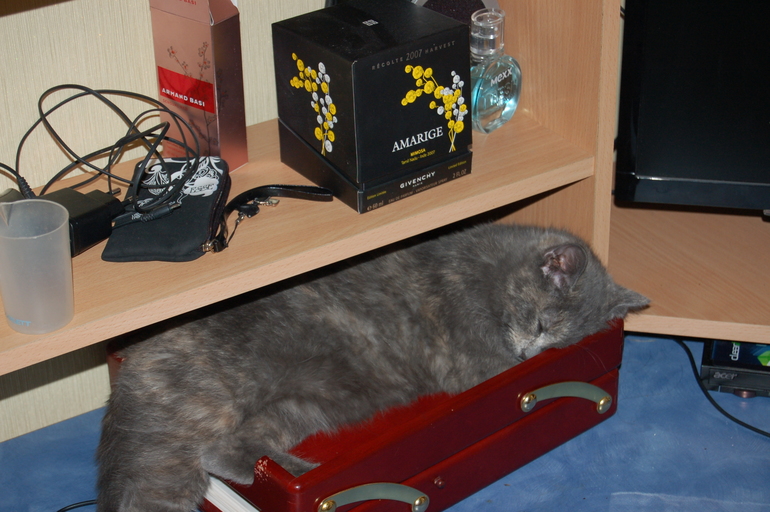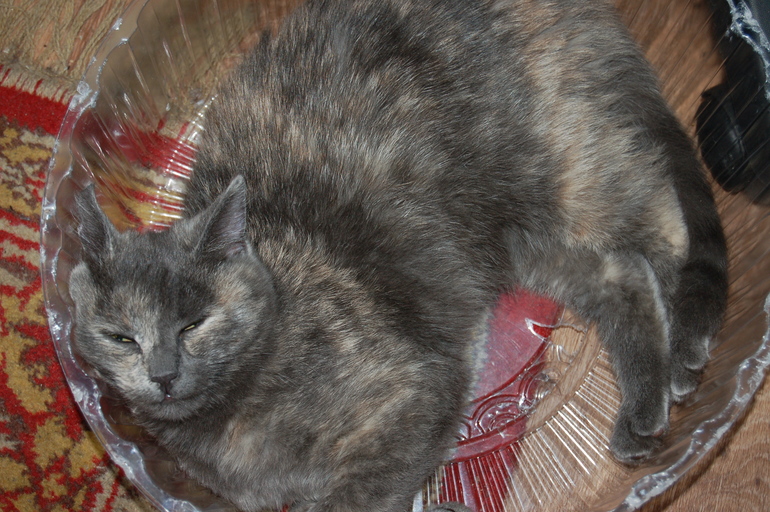 В ноябре состоялась наша свадьба и после свадьбы осталась крышка от торта. И пока Муся в нее помещалась, это было любимое место.