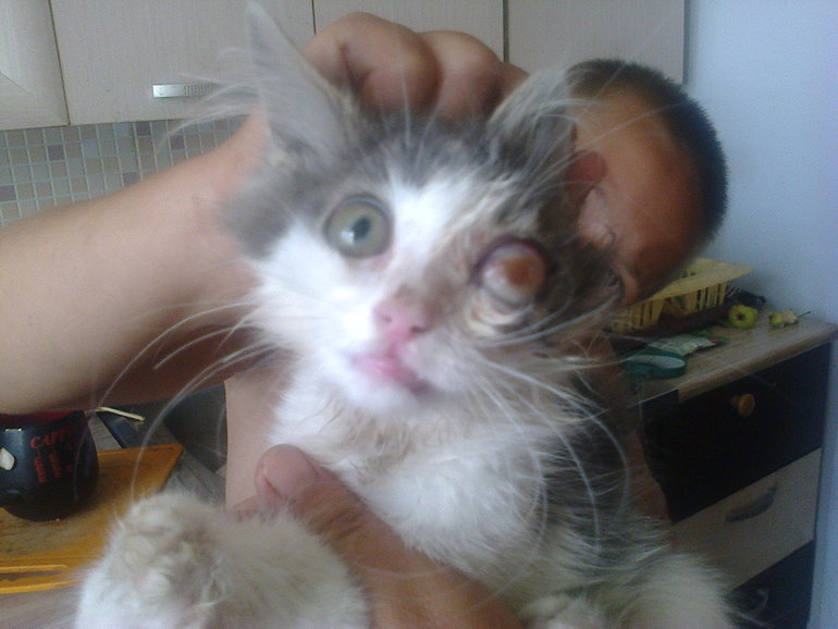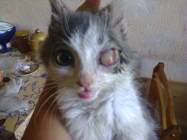 Помогите советомСын пару дней назад принес домой котенка. Худой, мокрый, полно блох... Но эти проблемы можно решить, а вот глаз...