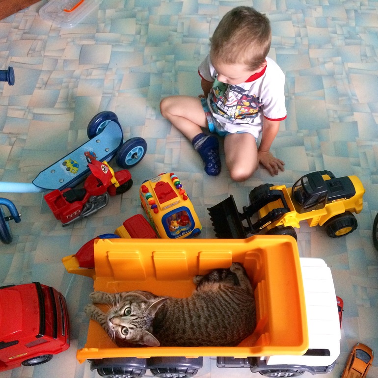 Играет он исключительно с сыном, готов на все, иногда они начинают играть в догонялки, или борятся, но Вася никогда не выпускает когти.