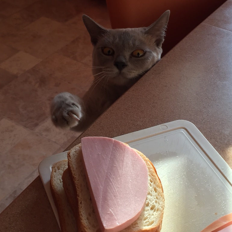 А у нас подобные мечты кота муж воплощает: как бы случайно забыв полосочку колбасы или попку сосиски на самом краю стола... ну и отвернется и опля... вот оно можно поохотиться)))