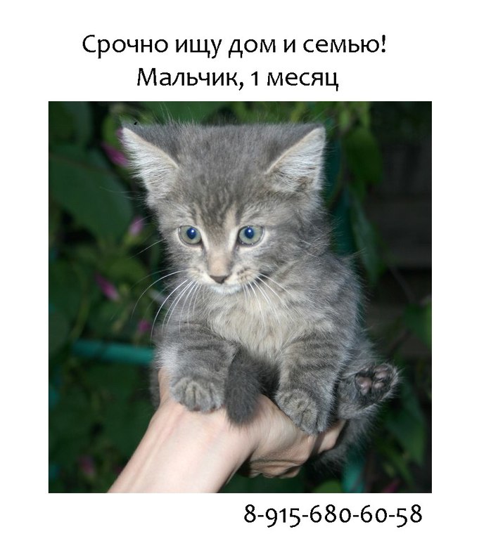 Малыш чуть не попал под машину, был оголодавшим и несчастным. От паразитов обработан, откормлен и весел. Здоров. Очень ласковый, игривый и умный. Красивого дымчатого цвета, в меру пушистый! Очень ищет любящих хозяев!