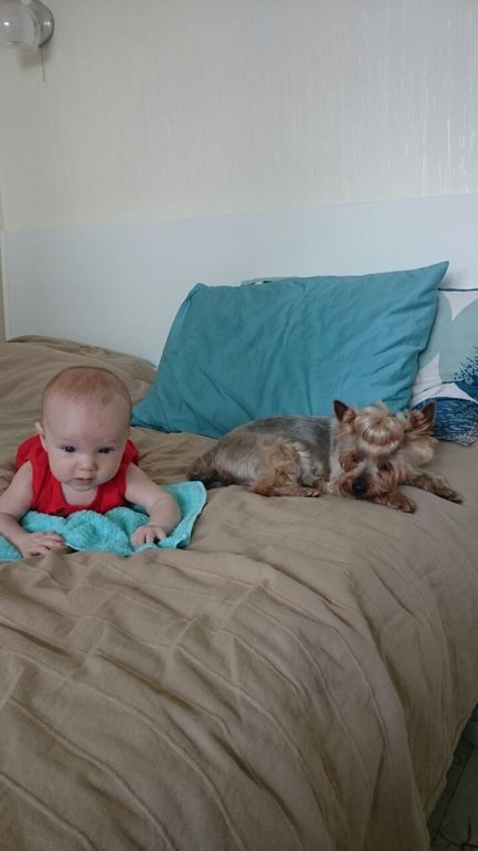 У нас Американский Стаффордширский Терьер (амстаф/стаф). Она появиласьу мужа раньше меня на 2 года. Спала спит и по ходу будет спать в нами в кровати. В беременность приучила ее ,кое-как, спать в ногах, либо со стороны мужа, бывает по старой памяти в подушки лезет, за что ругаю. С появлением ребенка, месяцев до 3 проблем вообще не было. Успевала и убрать, и погулять, и намыть.