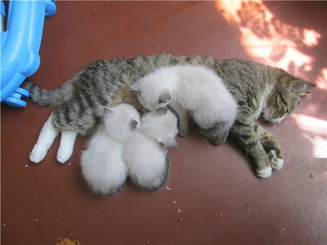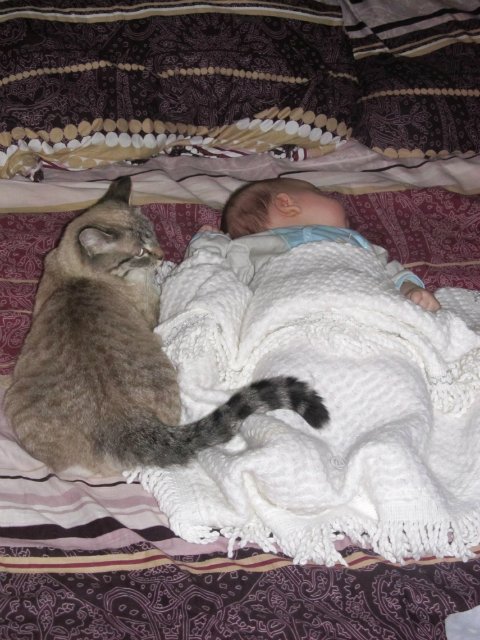 Кэсси довольно быстро привыкла к моей Васильке и с любопытством рассматривает ее,не трогает и даже охраняет сон ребенка! Мы всегда втроем, без кошки не спим и не лежим. Да, кто то скажет что это УЖАС...ребенок и животное - но Кэсси девочка домашняя и чистая. К тому же Василька всегда на своих пеленках, на которые кошке ни в коем случае лежать не разрешается.