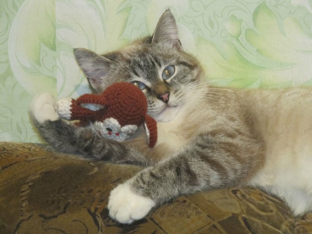 Третий год уже живет с нами моя красотулька Кэсси. Это первая кошка у меня(до этого были только коты) и она дольше всех живет с нами, поменяла не одну квартиру и даже сменила страну проживания вместе с нами! Она умница:хорошо знает мое настроение и интонацию, прекрасно понимает слова "нельзя", "иди ко мне моя девочка", "На". Забыла я как то на спинке дивана(а кошка с детства привыкла там спать) свою связанную игрушку Чичичи, так она с ней играла хорошо, но игрушка отобрана, так как связана для доченьки!