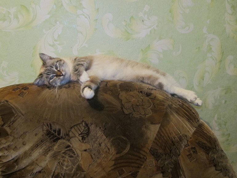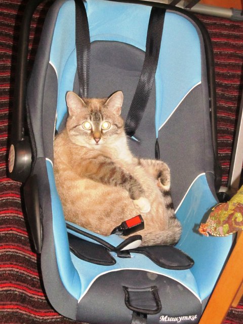 Вообще Кэсси всегда спит на спинке дивана, и ночью у меня в ногах, так что проблем с шерстью нет, я знаю где эта шерсть собирается и легче в уборке. Но Кэсси скоро снова СТАНЕТ МАМОЙ, во второй раз и стала искать место для "гнездышка". Погулять позволила ей во первых, для ее здоровья, во вторых - люди просят котят (три котенка уже заказаны). Вот как понравилось ей автокресло Васильки