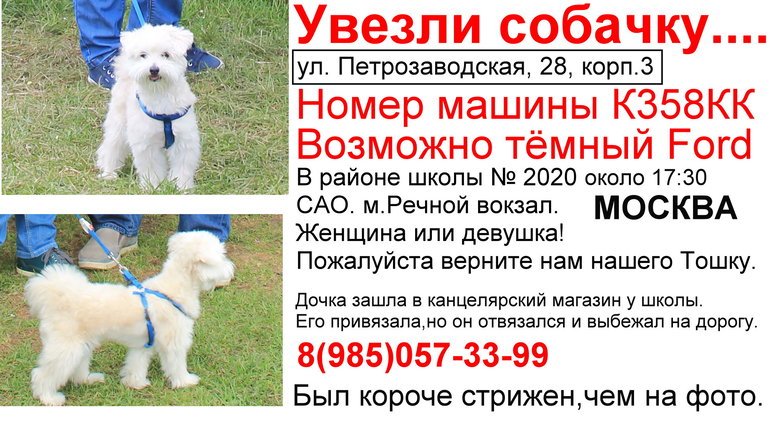 Дочка зашла в магазин у школы,его привязала.Тошка отвязался и выбежал на дорогу.Его подобрала женщина,предположительно на темном Форде с номером К358КК. Он был короче подстрижен чем на фото.Собачка не породистая,метис болонки и шпица. Он не подходит для разведения!