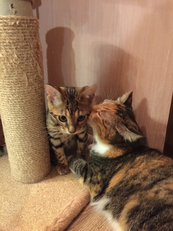 Настал ответственный момент знакомства- Алиса была в шоке, а котенок сразу почувствовал себя как дома... Алиса шипела, фыркала, на какое-то время я уже подумала, что не уживутся, зря затеяли, но постепенно она смягчилась... Потом как будто бы вообще потеряла интерес, а с утра окончательно уже приняла малыша... Играет с ним, вылизывает, уступает во всем, ищет его, если вдруг пропал из виду)))