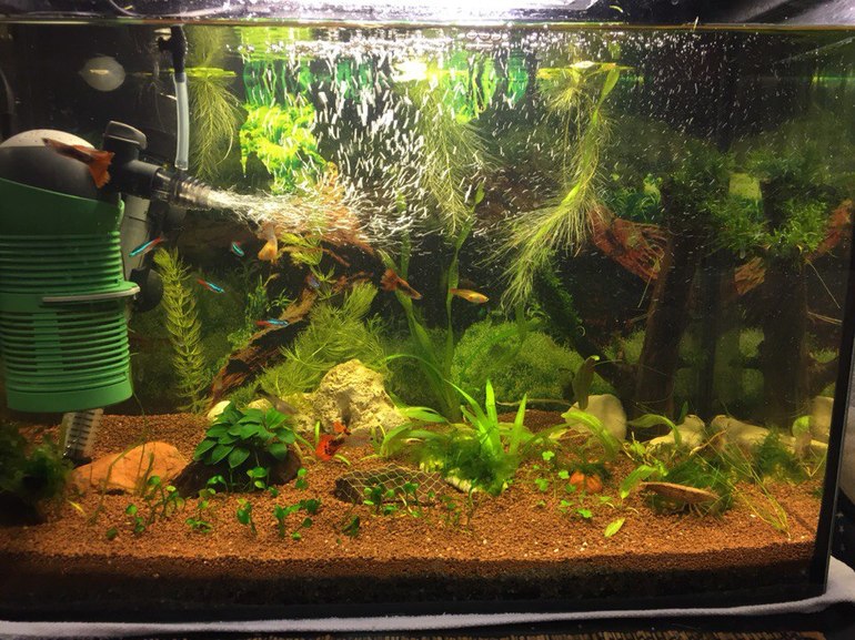 вот 1 из моих аквариумов, есть еще большой с черепахой и цихлидой и 10 литровый крветочник. а этот на 40 литров с раками и рыбами. Запущен недавно, поэтому растения пока маленькие.