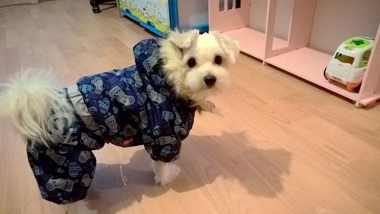 Белая шерсть это конечно другая статья и в грязь ее действительно легче прикрыть, чем отмывать. У меня черная и я ее там где реагенты не пускаю, поэтому в морозы она чистая. Если шлейку принял, то и комбез примет. Удачи))