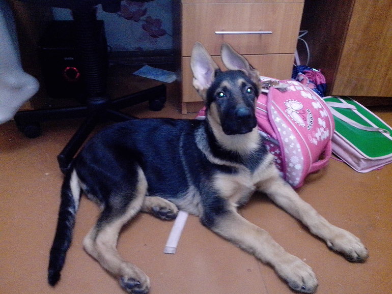 Это фото 2х недельной давности, сейчас уже немного побольше, цвет меняется немного, светлого больше появляется. Фоткать не дается, сразу уходит, натуральный мужик))) Уши встали как-раз 2 недели назад. Сейчас зубы меняются, в связи с этим пес стал кусачим.... Может подойти просто так цапнуть. Вроде не сильно, а зубы острые, поэтому ощутимо. Весит уже 18 кг. Конь блин.