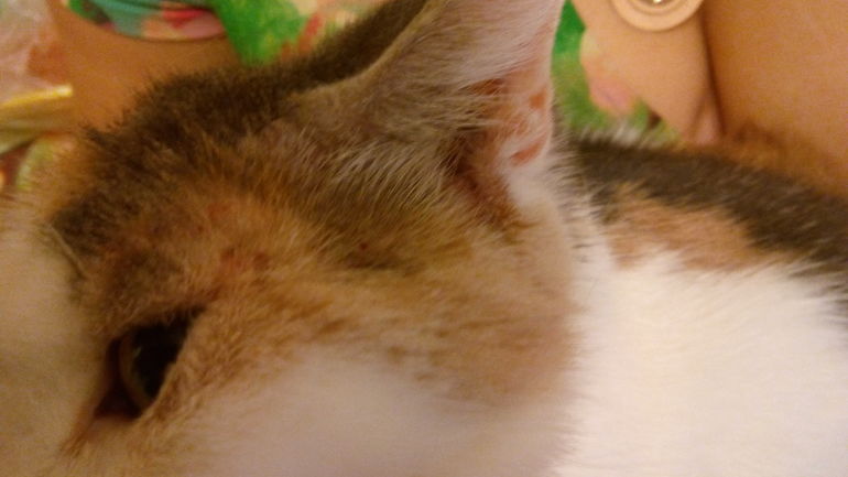 Скорее всего аллергия, у моей кошки такое на вискас было. Ветеринар рекомендовал рану промывать хлоргенсином/перекисью и мазать цинковой пастой. Ещё прописывал детский фенистил, но я не давала, просто корм сменила